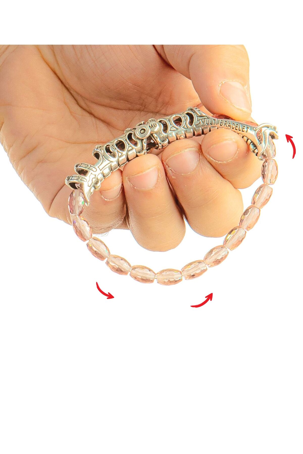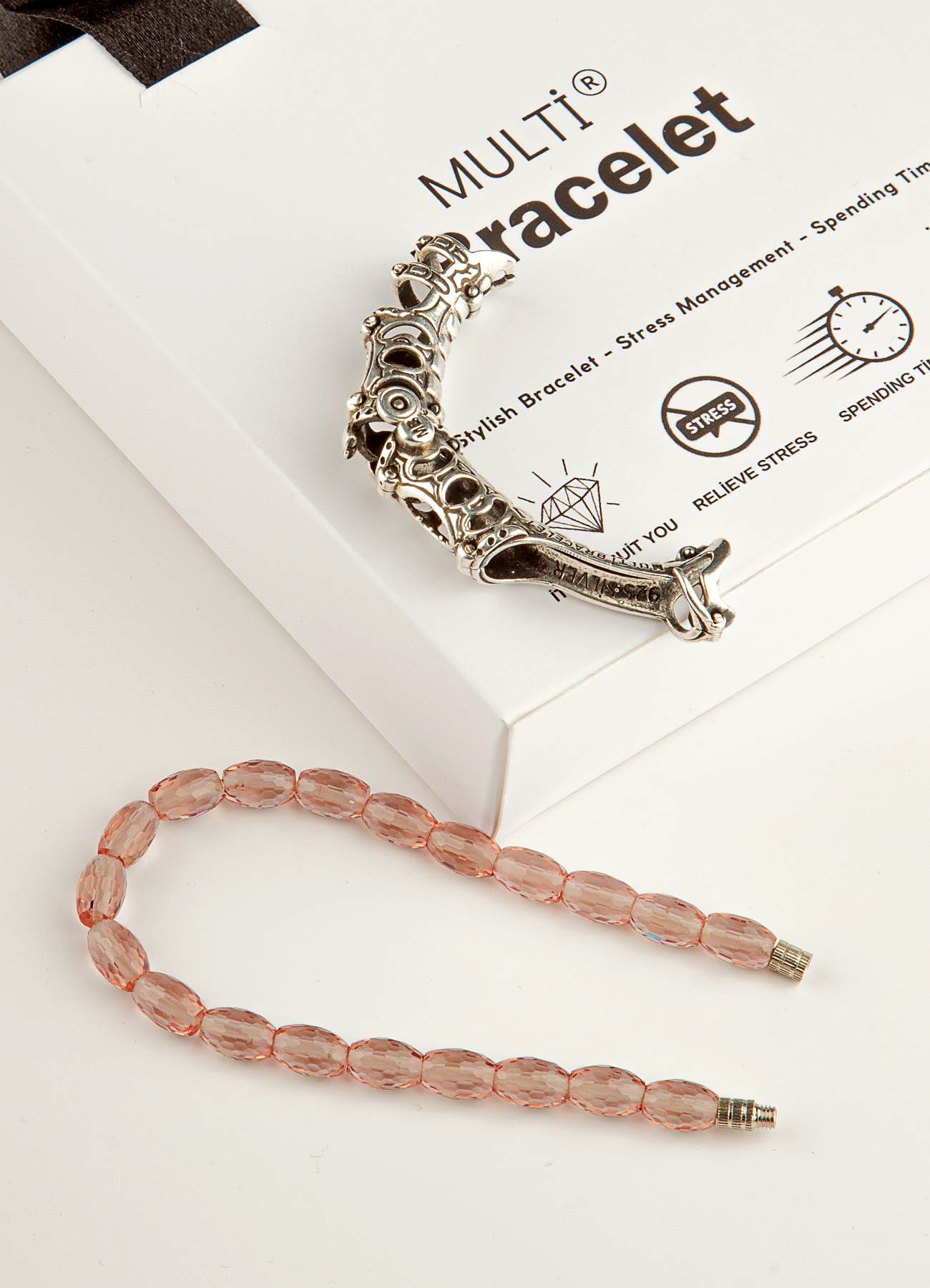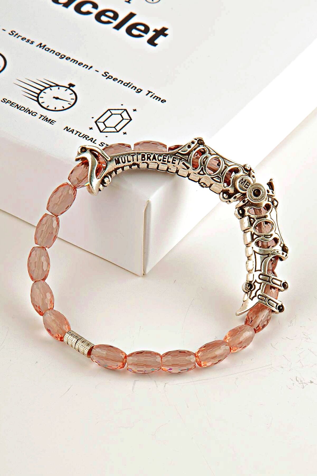 3 Farklı Kullanım: Aparatlı bileklik, sade doğaltaş bileklik ve stres çarkı formu.