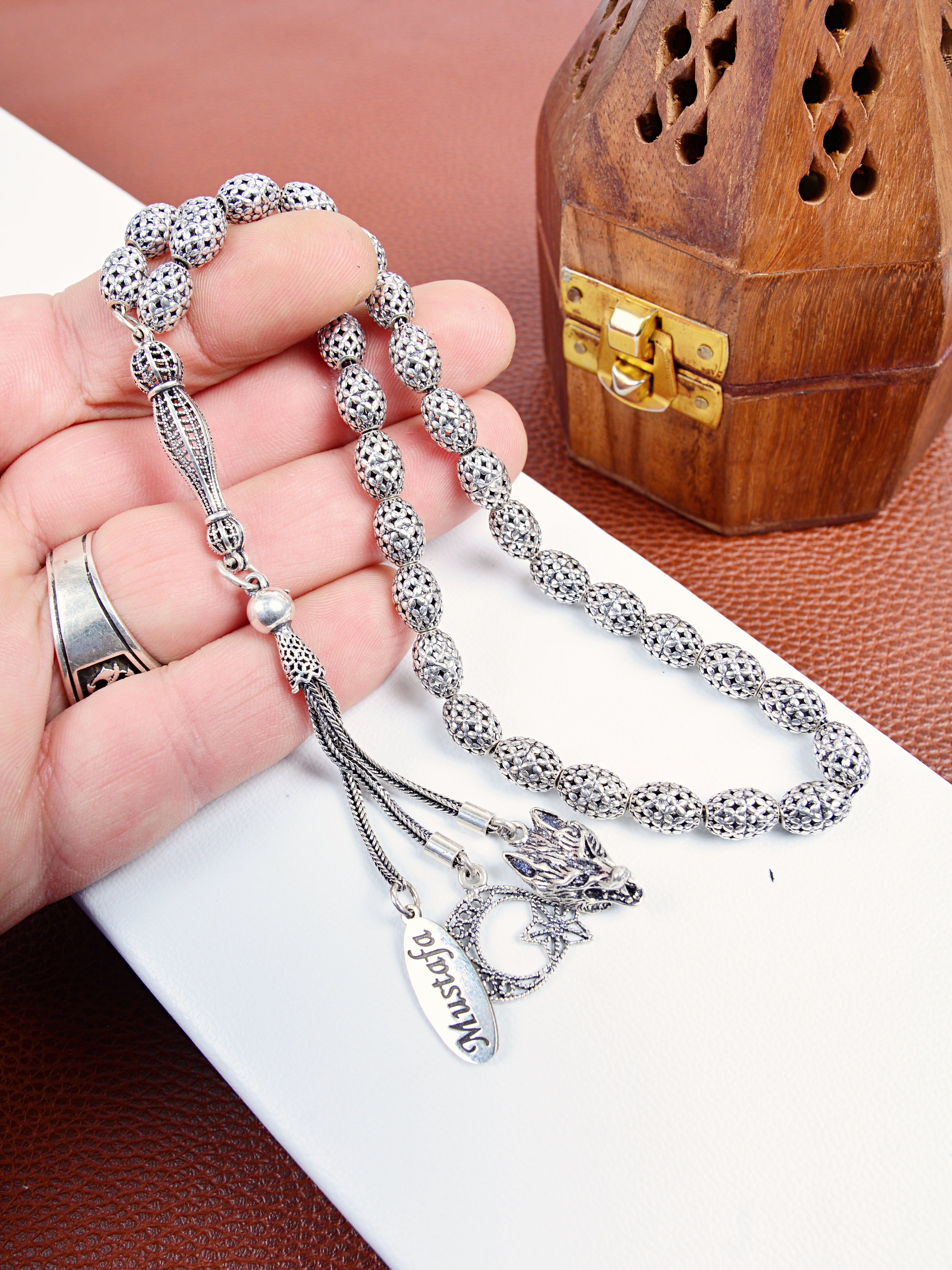 Tespih ipi dahil tamamen 925 ayar üst kalite gümüştür.