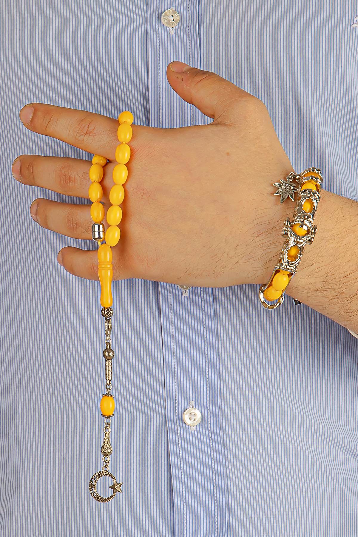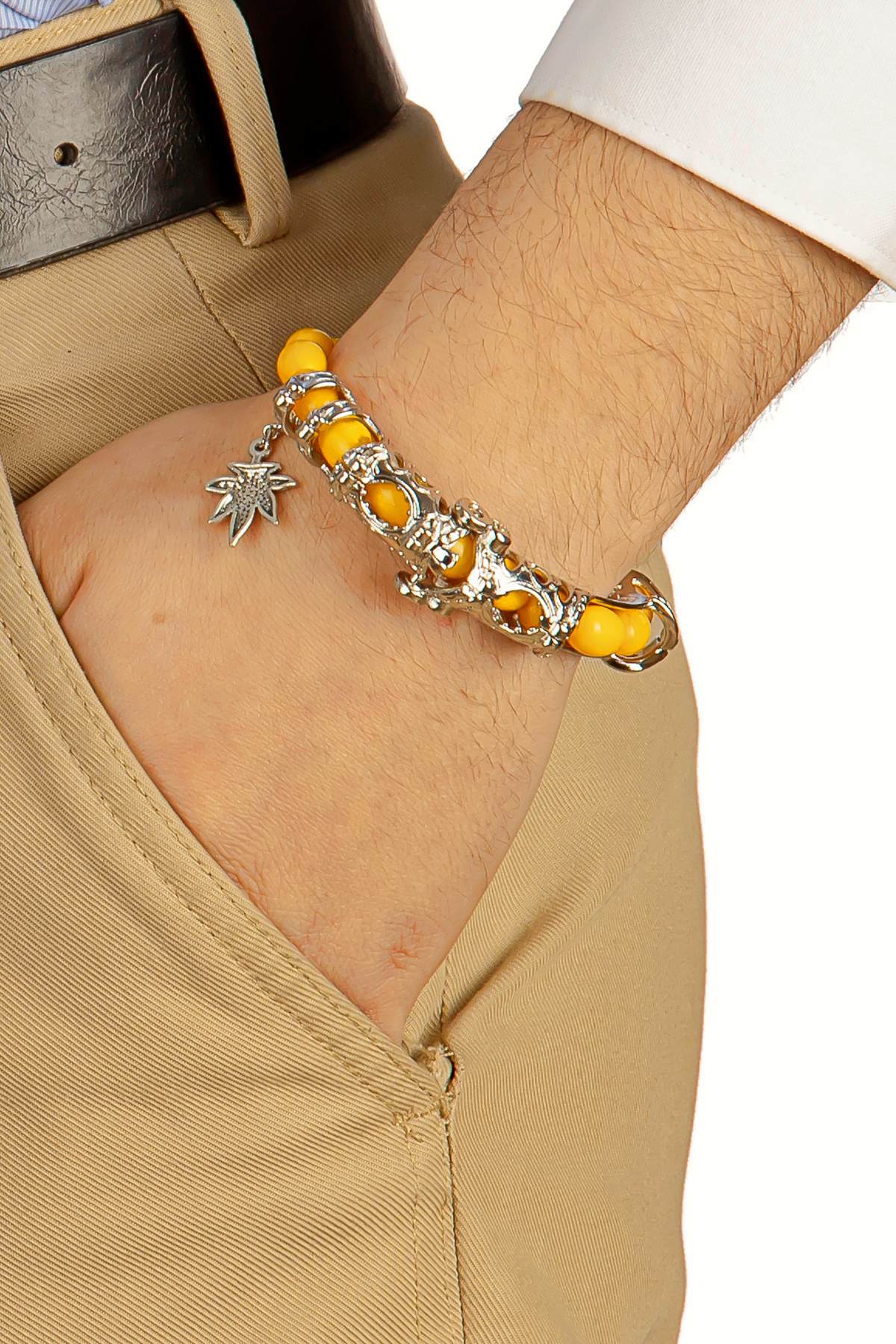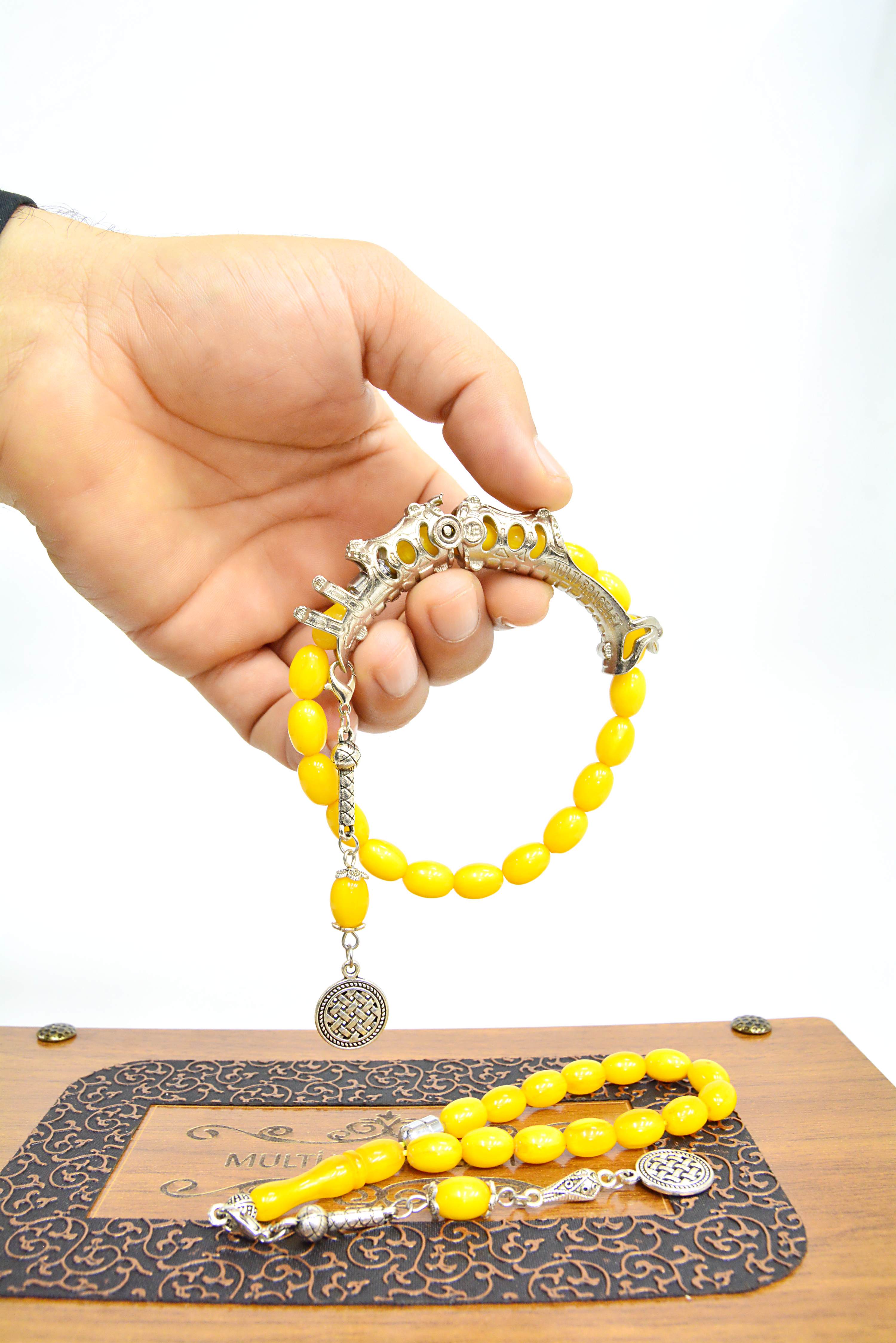 Limon Sarısı Toz Kehribar Multi Tespih, özel kararmaz flex aparat ve ultra güçlü mıknatıs sistemi sayesinde 2 farklı bileklik ve 2 farklı tespih formuna dönüşebilen çok fonksiyonlu ve yenilikçi bir tasarımdır.