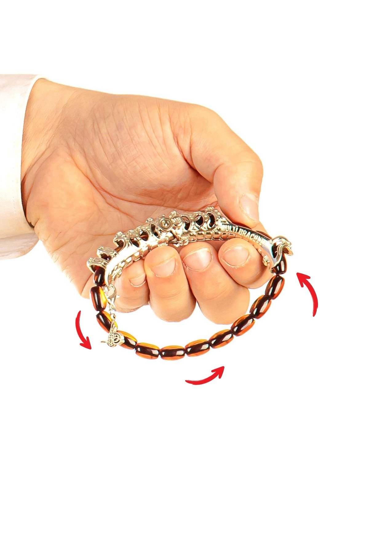 Sıkma Kehribar Multi Tespih, özel kararmaz flex aparat ve ultra güçlü mıknatıs sistemi sayesinde 2 farklı bileklik ve 2 farklı tespih formuna dönüşebilen çok fonksiyonlu bir tasarımdır.